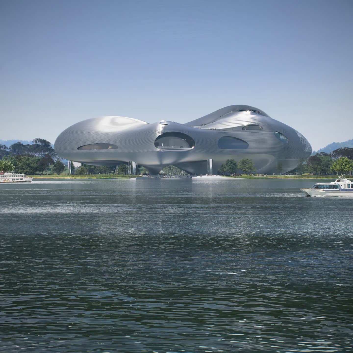 It will cover an area of 70,000 square meters and will be built primarily from curved, matte anodized aluminum tubes. The building will be raised on stilts to protect against potential flooding and reduce excavation work. The rooftop will feature a semi-outdoor garden, cascading terraced gardens, and an outdoor theater. Additionally, there will be another outdoor theater at ground level near the water.