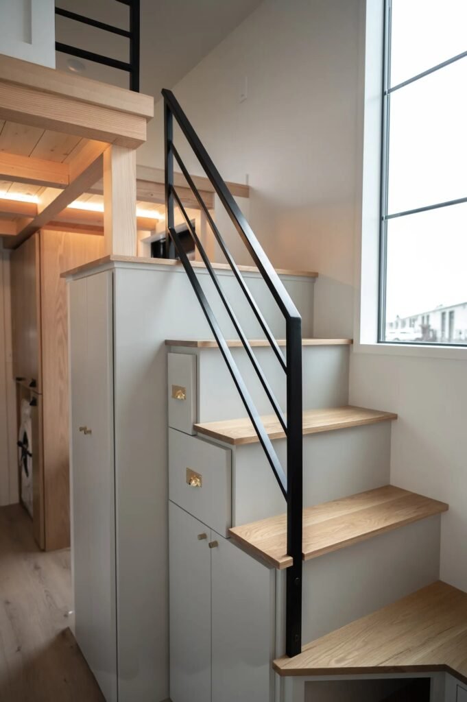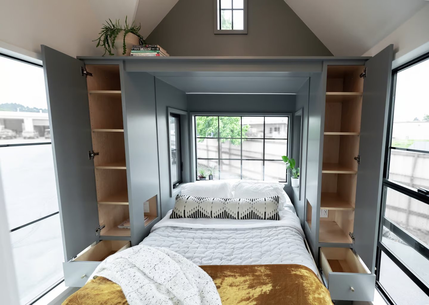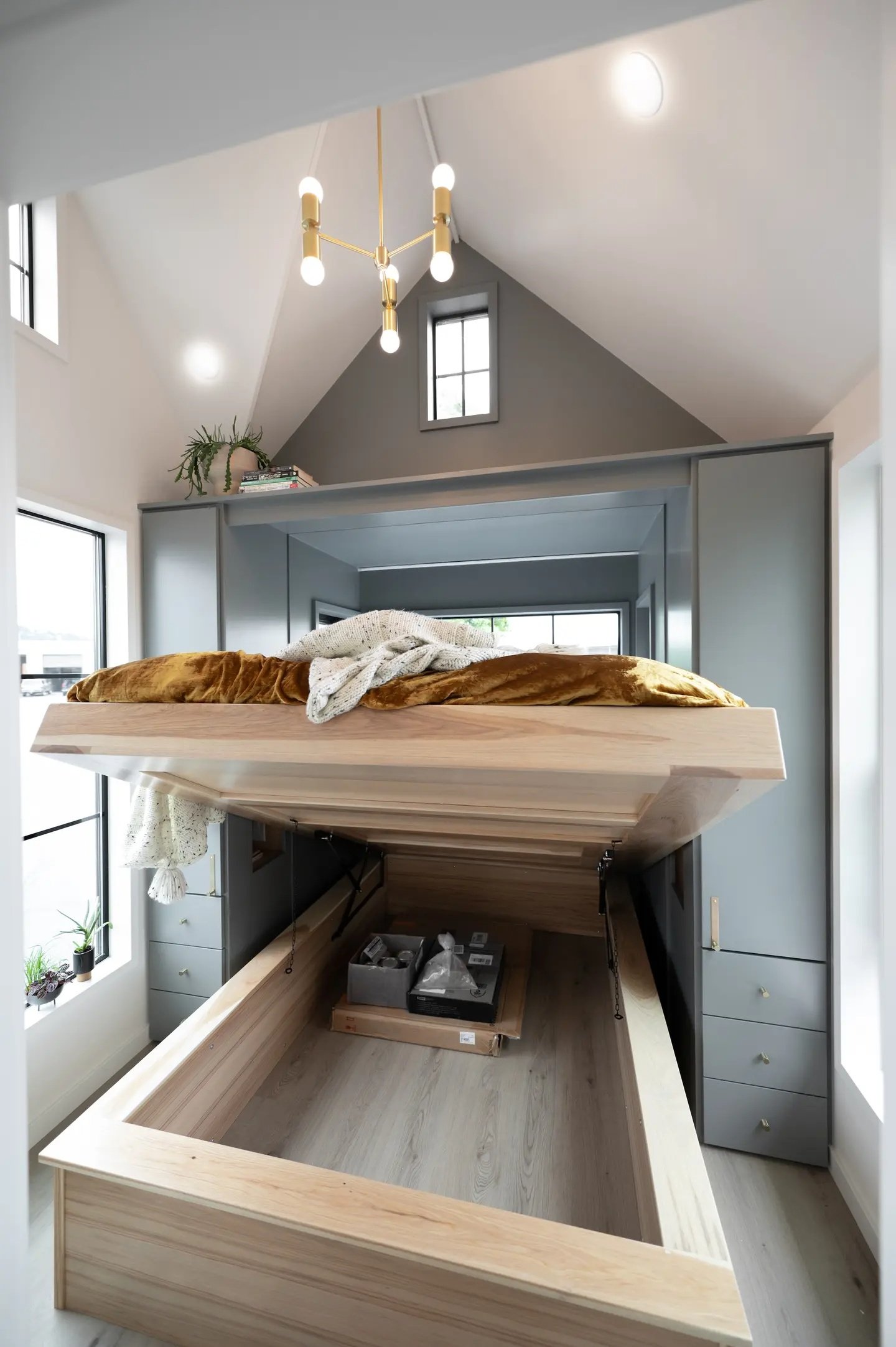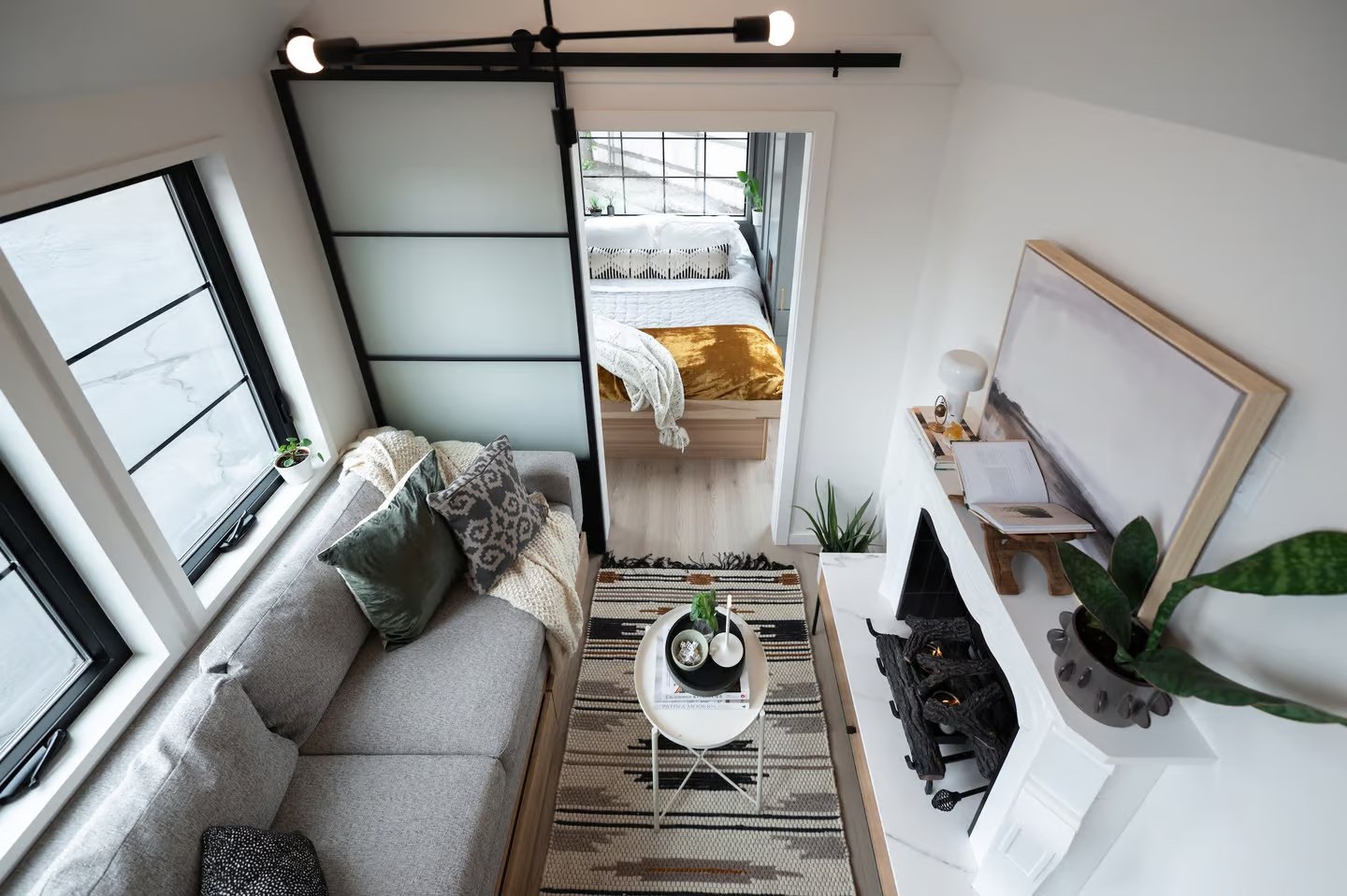 The Kootenay Inventory stands out for its two-bedroomlayout, which offers a level of privacy rarely seen in tiny homes. The master bedroom is located on the ground floor, offering enough headroom to stand comfortably.