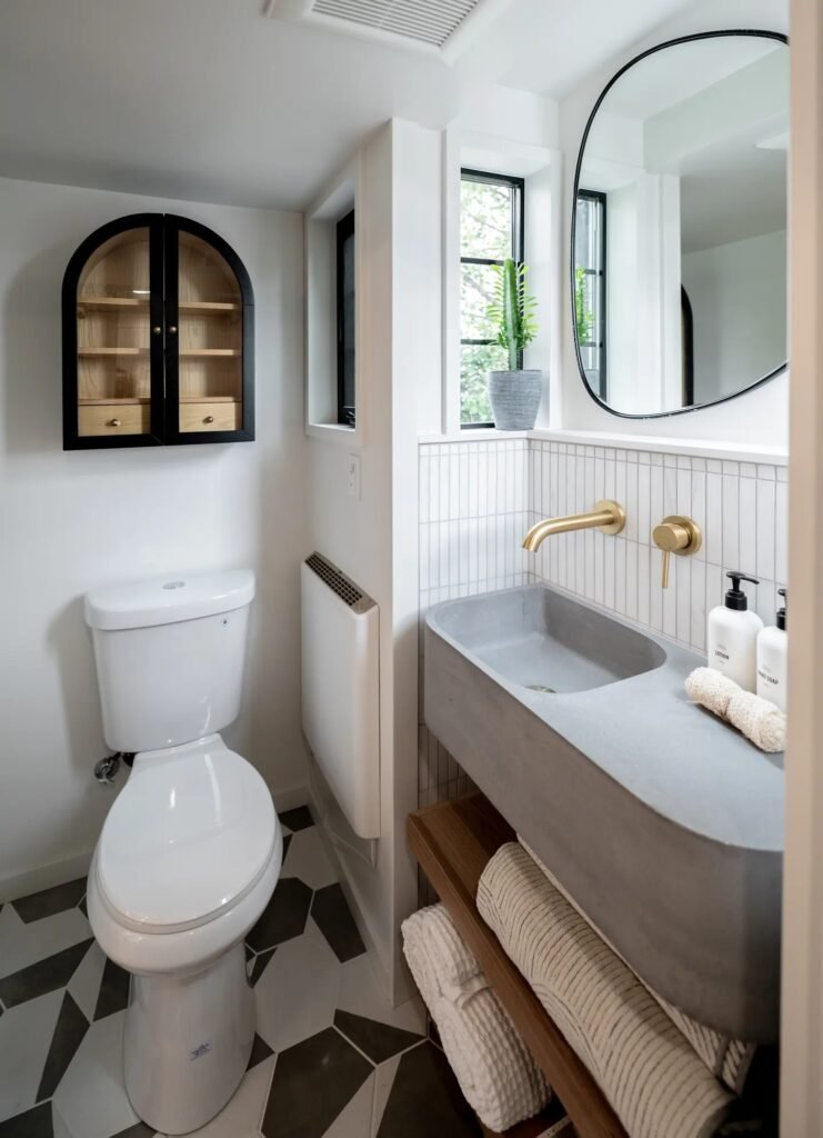 This space is ideal for relaxing, with the fireplace adding both warmth and ambiance. The home’s bathroom features modern amenities, including a concrete sink, flushing toilet, and a shower, providing all the essentials without sacrificing style.