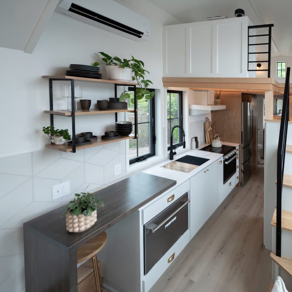 This kitchen includes a three-burner propane stove, oven, dishwasher, fridge/freezer combo, sink, and cabinetry, including a pull-out pantry. There’s also a washer/dryer combo, offering convenience within the tiny footprint. A rotating breakfast bar doubles as an office area and can be adjusted to create additional seating when needed. High-quality finishes like oak and cedar add warmth and a touch of luxury.