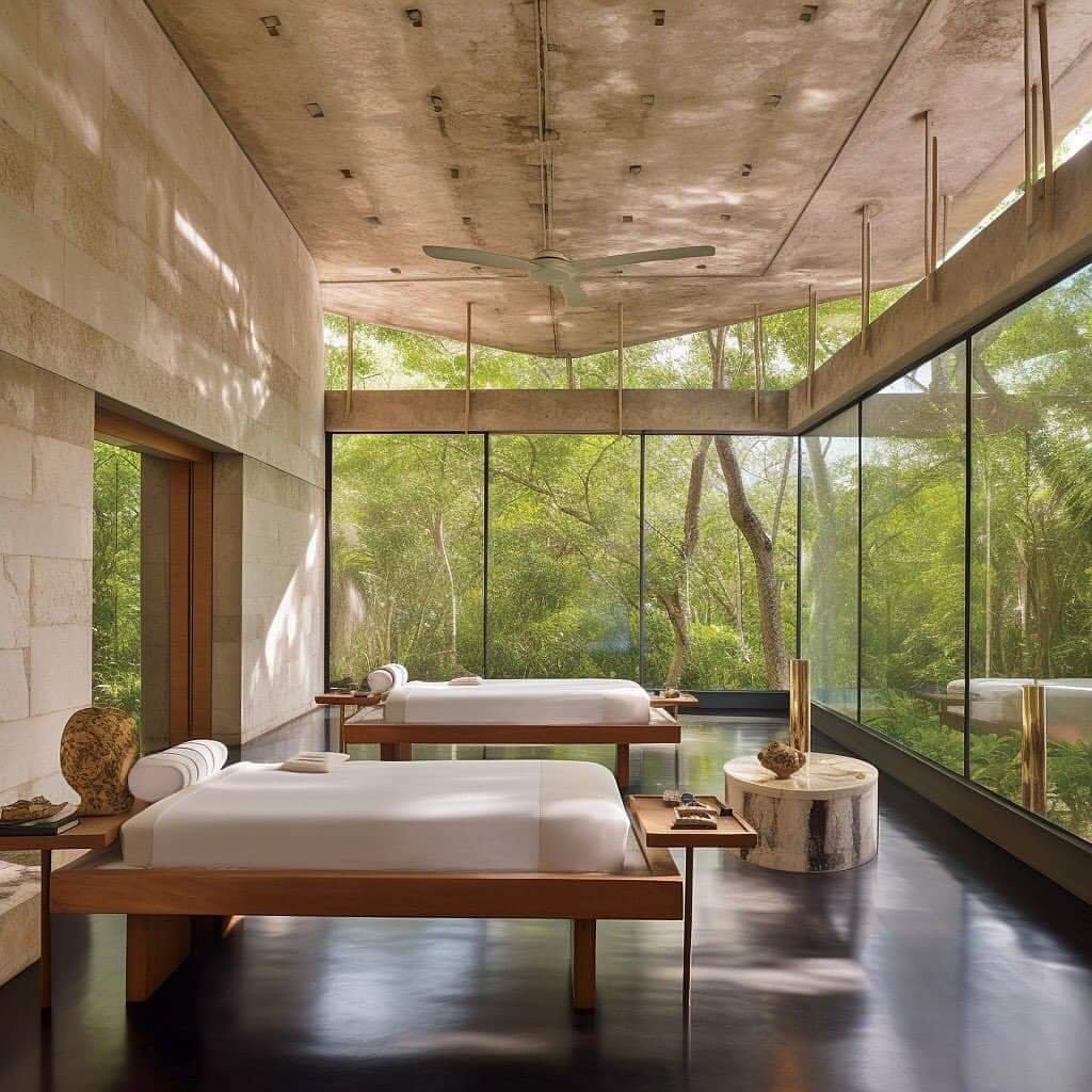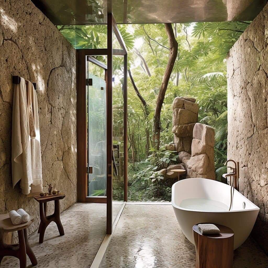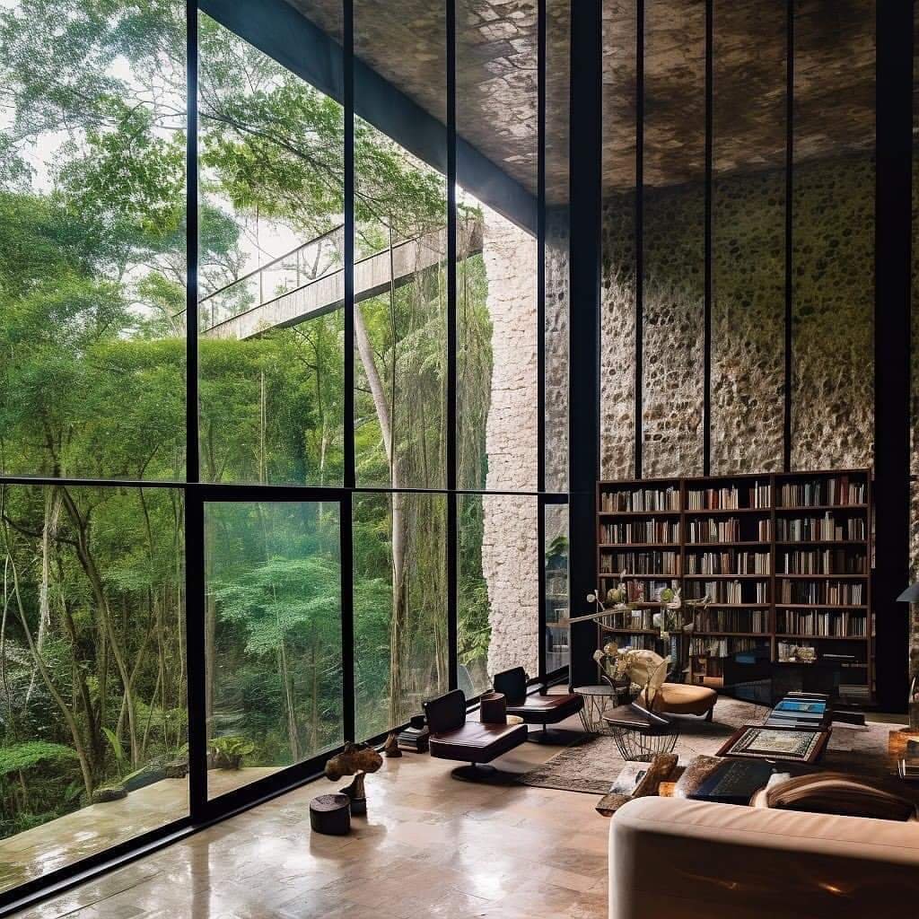 To ensure privacy, the glass walls could be tinted or treated with a one-way film that allows occupants to see out, but prevents outsiders from looking in. Additionally, strategic landscaping and the use of curtains or blinds could help to create privacy in certain areas of the house.